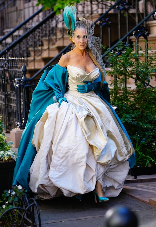 While Carrie originally tasks Jackie’s wife Smoke, an up-and-coming designer, to create her Met Gala dress, a last-minute seamstress emergency leaves Carrie without a gown just moments before the event. Luckily, she has an alternative option to go with the teal cape Smoke designed for her—the Vivienne Westwood wedding gown and bird topper she famously wore on the day Big left her at the alter.