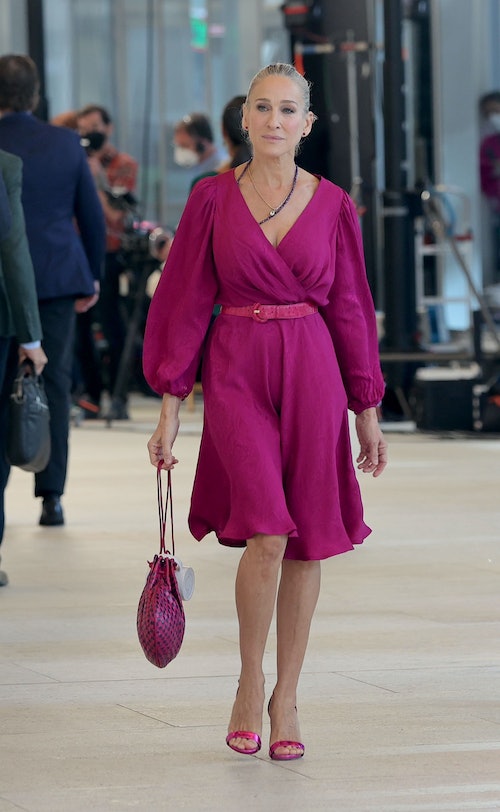 Carrie loses her podcast and her friend with benefits in just a matter of minutes, but at least she looks good in this all-magenta look. While Carrie usually loves to mix patterns and colors, this time, she opts to go monochrome in the final scene of episode two, wearing a belted wrap dress and a matching bag, both vintage pieces. She then completes the look with metallic fuchsia heeled sandals and a pendant necklace from Jemma Wynne.