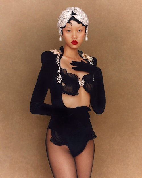 Taylor-Joy stepped out at the Vanity Fair party in a custom Miss Sohee look, inspired by a piece from the brand’s fall/winter 2021 collection. While Sohee Park’s original design featured a bodysuit, for Taylor-Joy, she turned it into a mini, featuring a corseted waist and a beautiful, exposed bra with butterfly wing-like adornments. Padded shoulders were decorated with floral-like embellishments and then continued into attached gloves that covered her arms and hands. The look was then completed with a crystal-covered headpiece that attached to two drop pearl earrings.