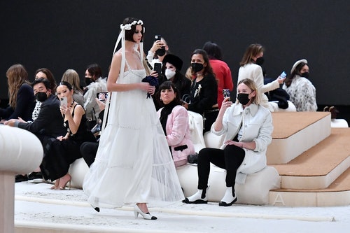 Chanel ambassador Margaret Qualley closed out the fall 2021 show by throwing the bouquet over her head with excellent aim: It soared smoothly into the hands of editor Laura Brown.