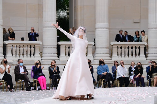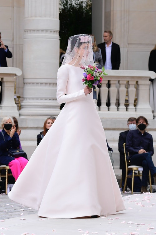 Vittoria Ceretti returned to the runway as the bride for Chanel’s first couture show without Karl Lagerfeld in decades, which also marked Viard’s couture debut. This time, Ceretti also kept things casual: She wore a silky pale pink ensemble that bore a resemblance to a (very chic) pair of pajamas.