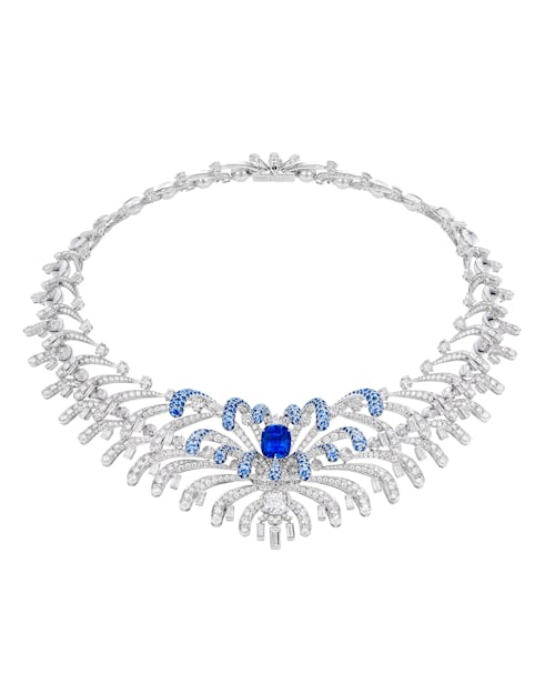 Move they do. Necklaces ripple with articulated links and trembling stones. Earrings come undone and transform. A standout piece, the Cento necklace (pictured above), pays direct homage to Villa d’Este’s famed Avenue of the Hundred Fountains, with rock crystals layered over diamonds like mist filtering moonlight. “You get this fish-eye distortion,” says Delettrez Fendi of this refractive combination. “It gives the effect of water in motion, of splashes suspended.” There is theatricality, yes, but also restraint; the collection shimmers with secrets, avoiding the carnivalesque in favor of tempered elegance. Blues are soft and watery; fiery ruby reds and yellows nod to Rome’s incendiary sunsets without veering into tutti-frutti territory. “I wanted to enclose all the skies of Rome inside these droplets,” she says, “but more like fireworks before they explode.”