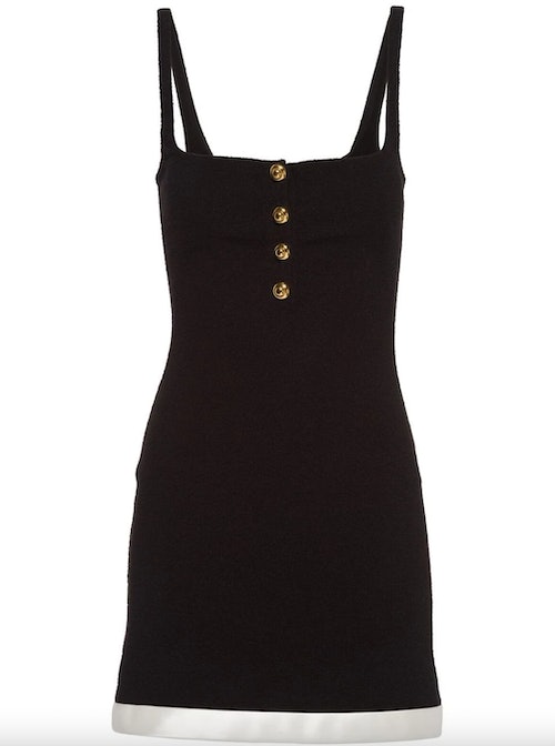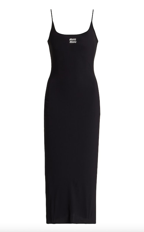 Both of course wore head-to-toe Miu Miu, but let’s start with Hadid. The 28-year-old showed up in a plunging black dress whose form-fitting silhouette seemed to mimic the shape of a slip. It was nearly entirely black—aside from a white Miu Miu logo near the top of the bodice—and featured two thin spaghetti straps.