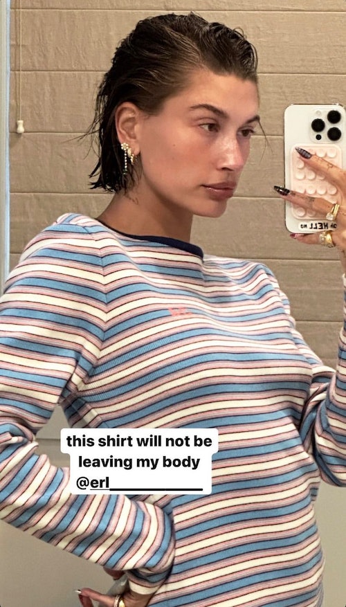 In another story, the model posted a close up of the pastel long sleeve from the Venice Beach-based brand. “This shirt will not be leaving my body,” she wrote (thankfully for Justin, he’s a frequent wearer of the label, so finding a replacement probably won’t be too tricky).