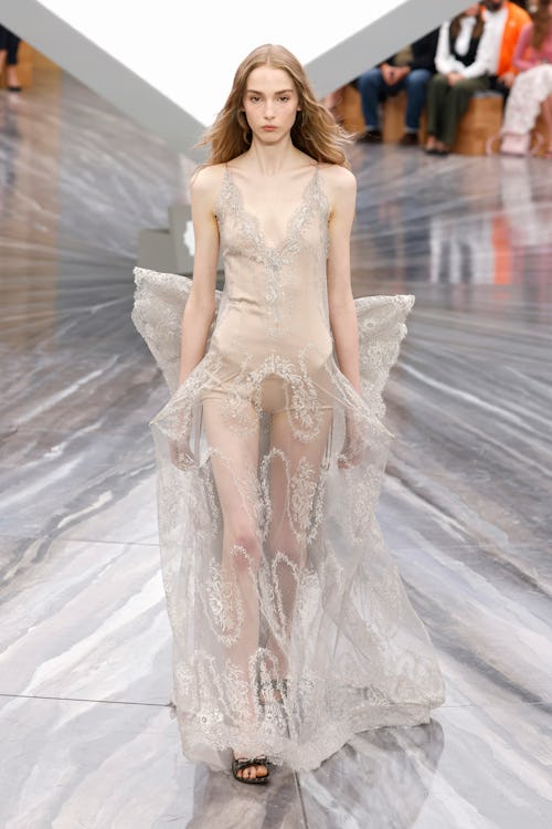 To cap off his spring 2026 runway show, designer Anthony Vaccarello sent out a fleet of 15 final gowns—massive ruffle dresses that rippled in the breeze, and came in all kinds: with a sheer panel at the front; corseted; featuring waterfalls of frills.