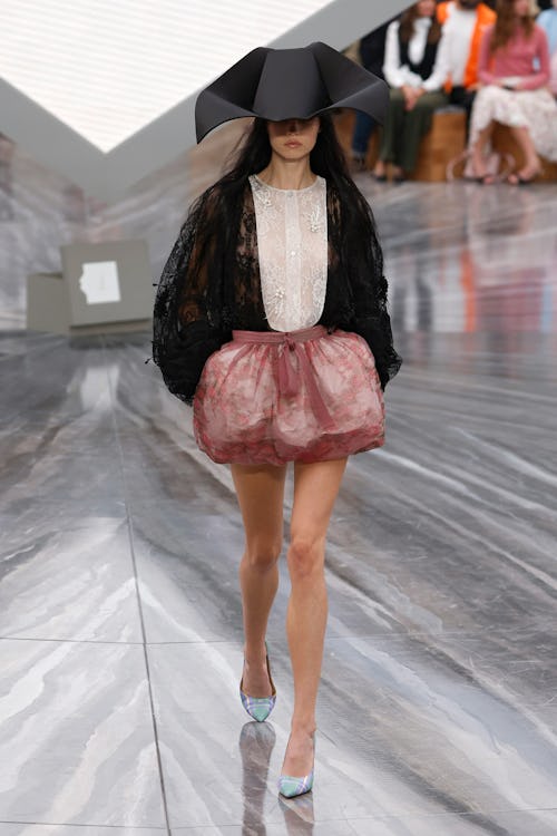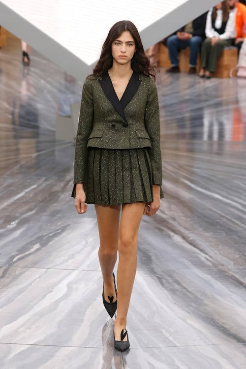 Turning the page is the essence of a designer debut, but Loewe alum Jonathan Anderson’s first Dior womenswear show did something almost unheard of. It began with an Adam Curtis–directed documentary short projected on a pyramidal screen recapping the maison’s many chapters written before Anderson. The horror-meets-homage film wove together moments from Dior’s seven previous creative directors, including Christian Dior’s “flower women,” Yves Saint Laurent’s dynamic trapeze shape, Gianfranco Ferré’s bold, architectural jewel tones, and John Galliano’s theatrical millinery. Anderson paid special tribute to his immediate predecessor, Maria Grazia Chiuri, with three clips capturing her art-world gravitas: the Penny Slinger fall 2019 couture dollhouse dress, and the Orlando-inspired fall 2025 mise-en-scène staged by the late Robert Wilson. It was the perfect way to start a runway show that brought Dior’s house codes into the future.